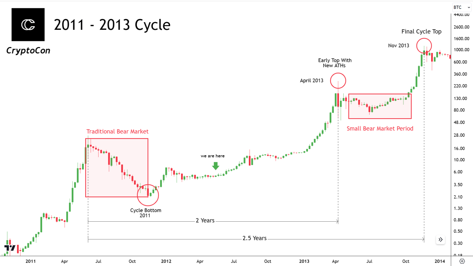 CryptoCon drew attention to the 2011-2013 cycle, a period that didn’t adhere to traditional patterns. This cycle experienced both an early and a later top. Could this be a precedent for the current cycle? “Both of these groups of people seem to forget one particular cycle that seemingly defied all of the rules. 2011 – 2013,” he recalled.