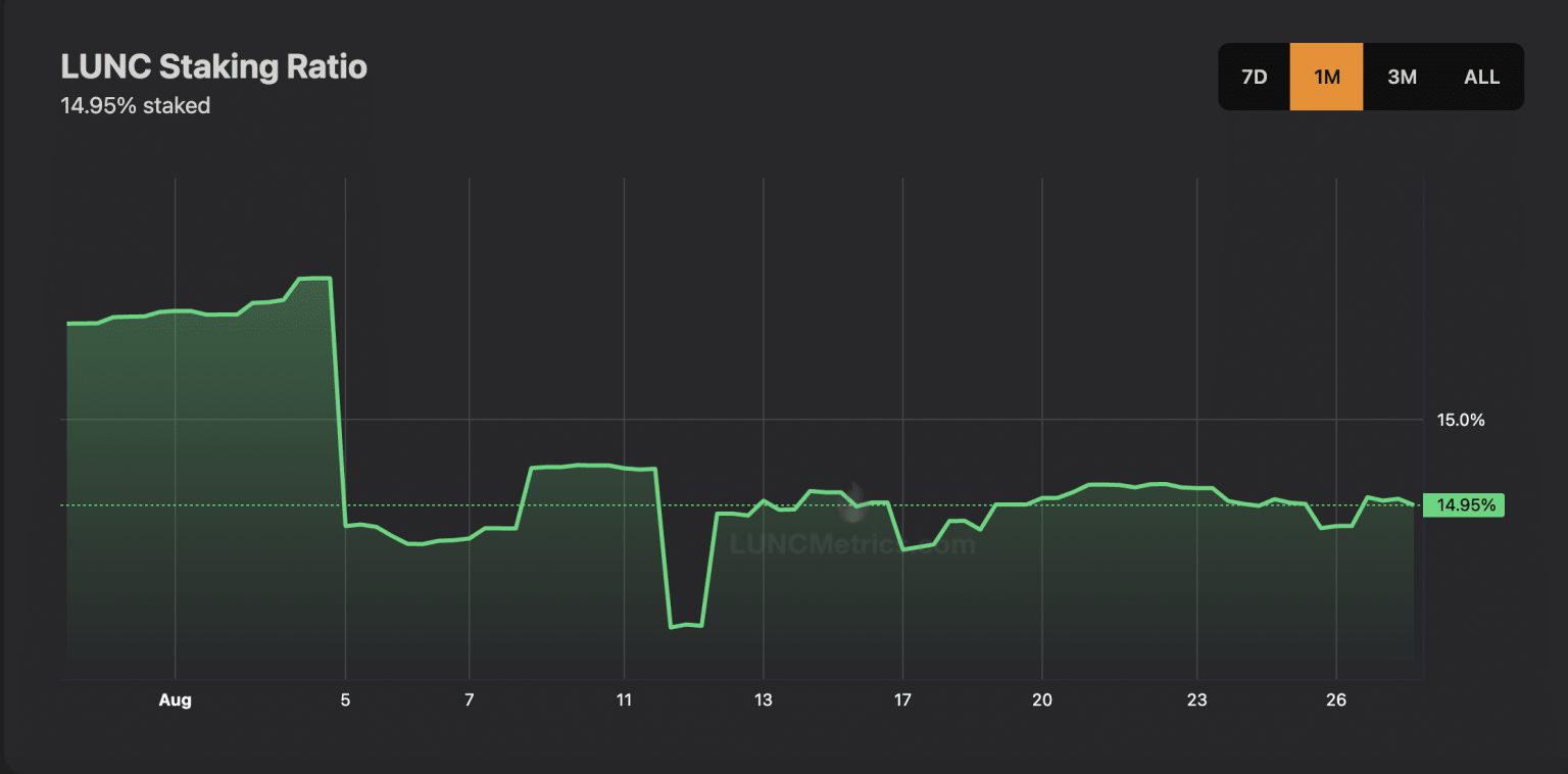 The month so far has been marked by a decline in LUNC staking. At 14.95% at press time, the total percentage of staked LUNC from its circulating supply has plummeted by 1%.