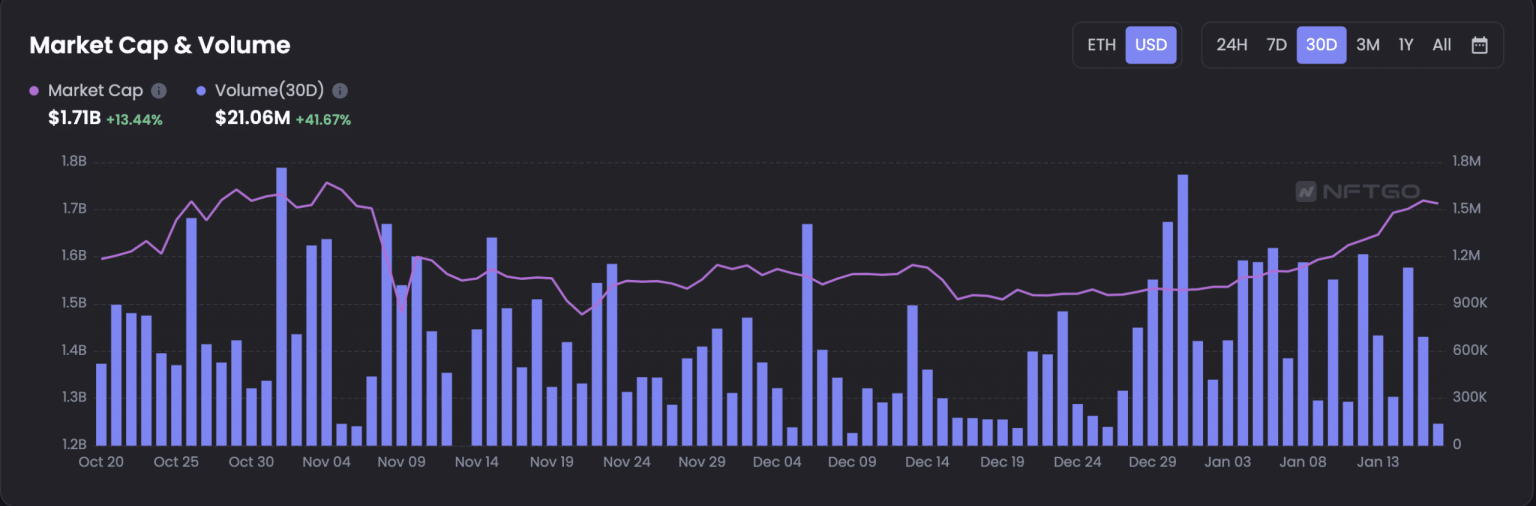 According to NFT analytics platform NFTGo, CryptoPunks’ market capitalization stood at $1.71 billion at press time. In the last month, this rallied by 14%.