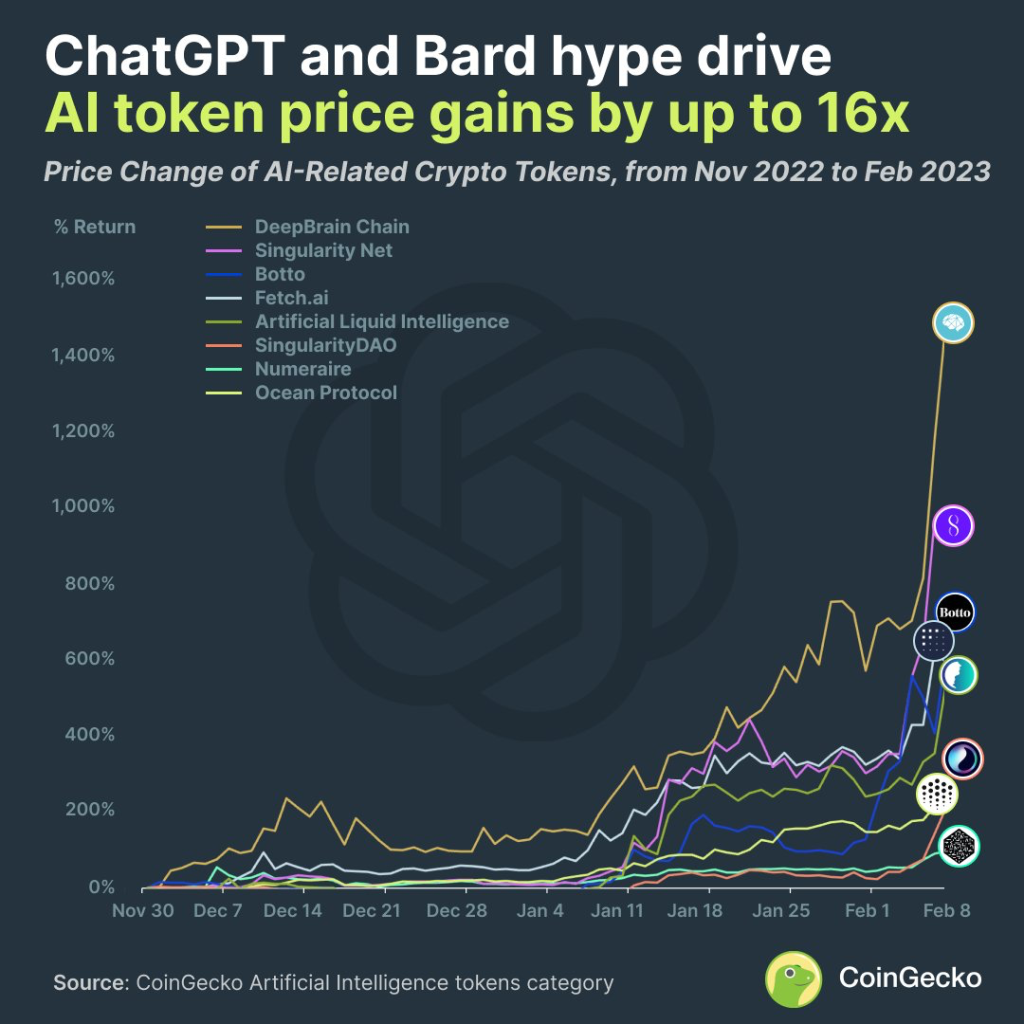 Additionally, artificial intelligence (AI) rested crypto tokens have recorded significant gains in the past few weeks. According to research conducted by Coingecko, AI-related tokens have rallied up to 16 times between November 2022 and February 2023.