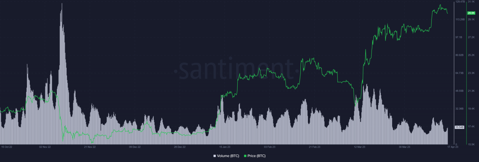 However, the volume metric indicated regular activity since then, and during this time, BTC crossed the $30,000 mark.