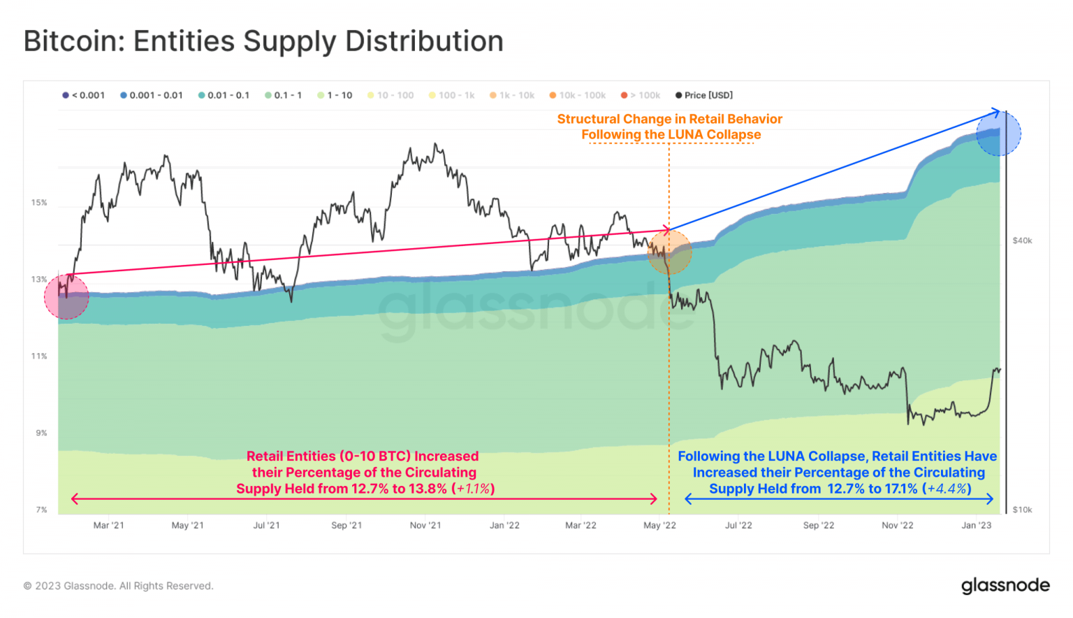 Since the Terra Luna [LUNC] collapse, the number of Bitcoin [BTC] retail investors continued to rise and stood at 17.1% of the total circulating supply at press time, according to Glassnode.