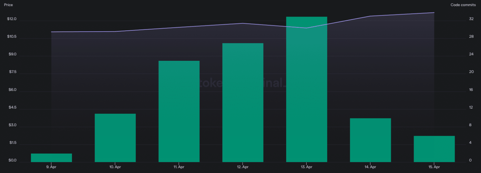 Following the development, code commits on the Aptos blockchain significantly increased. As of 13 April, the commits rose as high as 33, according to Token Terminal. Code commits reveal the contributions of developers to a particular project.