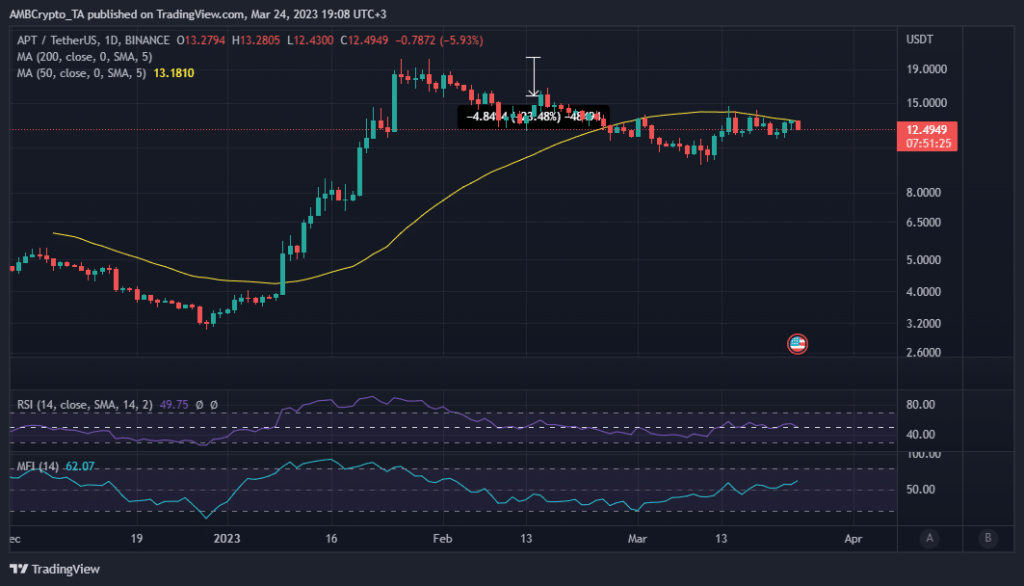 Aptos’ native cryptocurrency APT struggled to find directional performance this week after its rally last week. This suggests that the bulls ran out of momentum. Meanwhile, the bears have been pushing to take over. APT tanked by 6.8% to its $12.20 press time price.