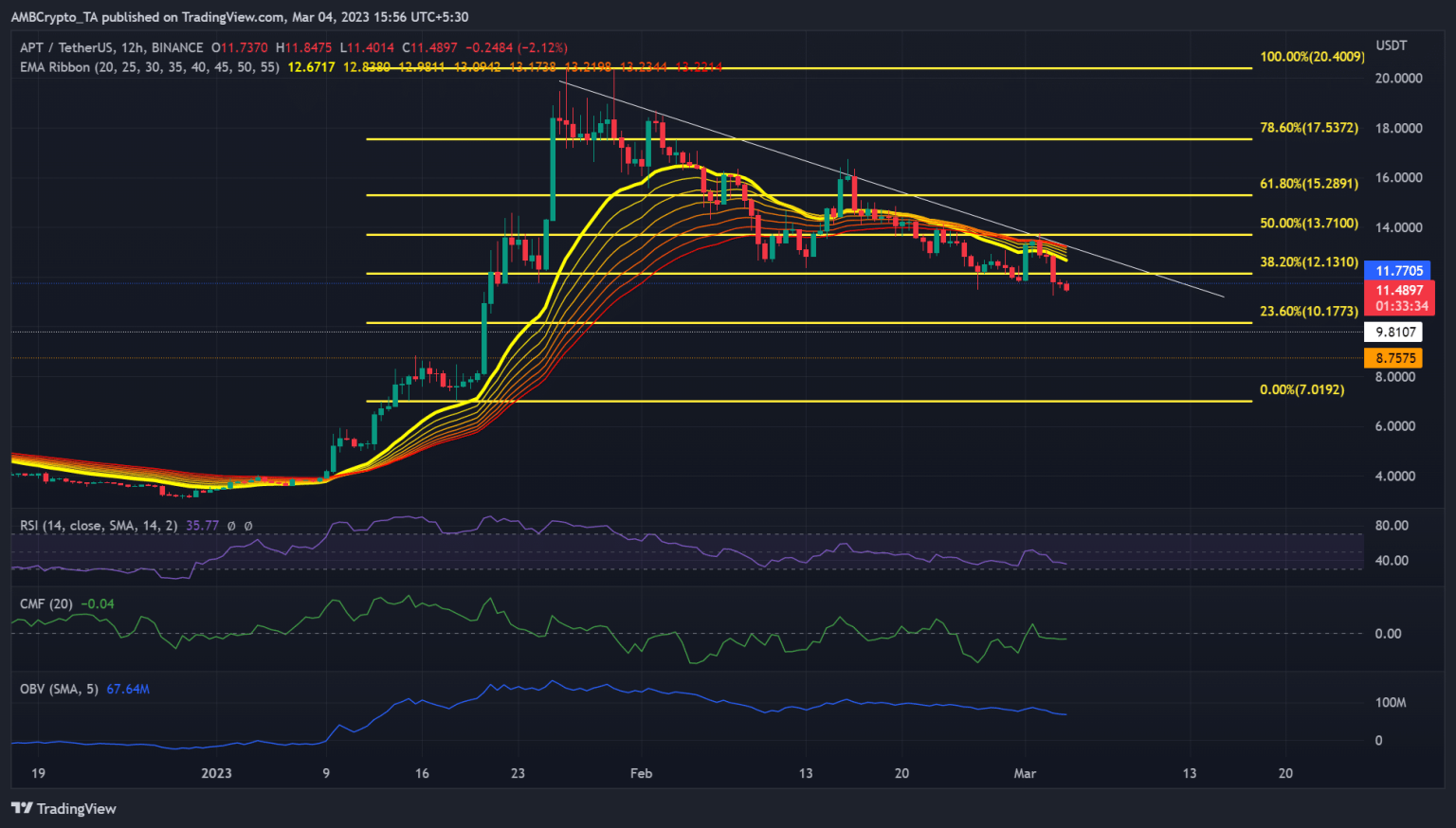 Bitcoin’s [BTC] sharp drop on Thursday (2 March) saw APT break below the 38.2% Fib support level ($12.1310). The support level prevented steep declines previously. But the bulls failed to defend it at the time of writing, which could tip the scale in favor of bears.