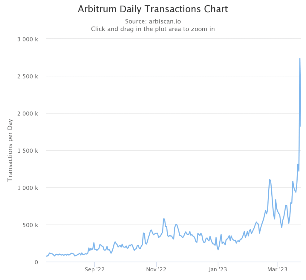 Arbitrum also recorded a new daily high of 2.73 million transactions on 23 March, surpassing the previous high of 1.10 million transactions registered on 21 February.