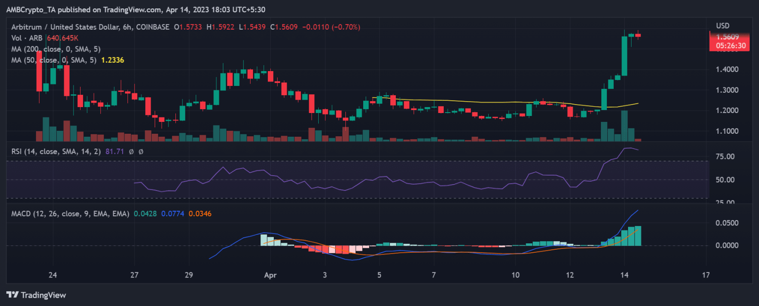 On 13 April, Arbitrum witnessed an unprecedented surge in its value since its launch. By the end of that trading day, the value had soared by more than 14%.
