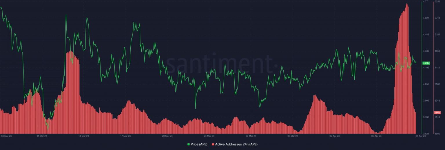 According to data provided by Santiment, on 7 April, there was a notable surge in two important metrics for ApeCoin: 24-hour active addresses and network growth.