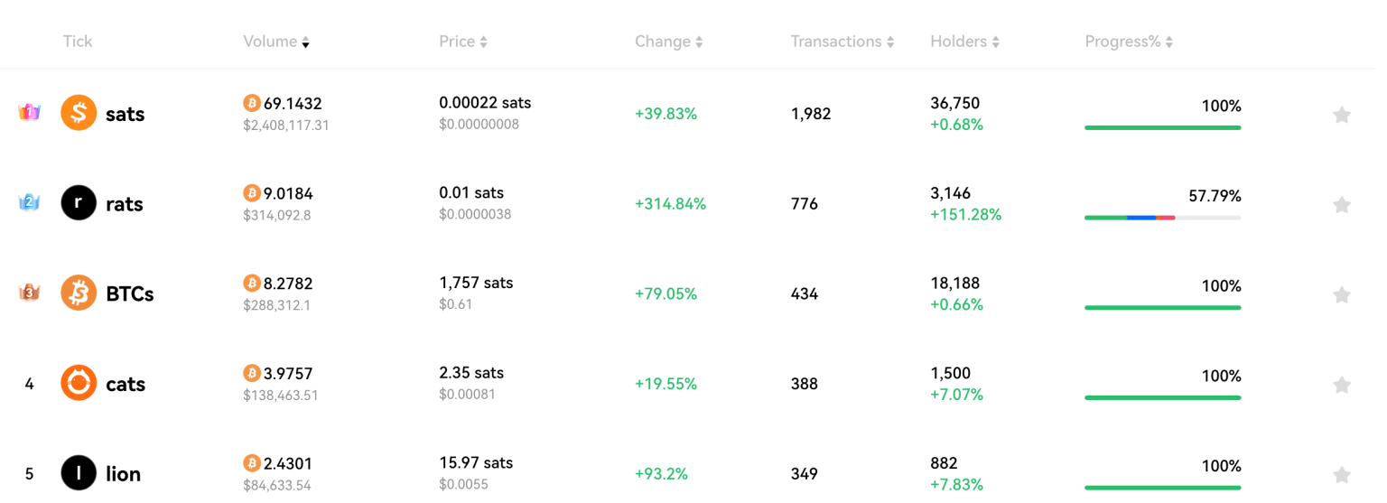 In the last week, sats collection went up by 124%, the “BTCs” collection surged by 30%, and “honk” grew by 300%, and “ordi” by 13%. Among them, “sats” held the top spot with a market cap of about $166 million, surpassing “ordi” with approximately $130 million.
