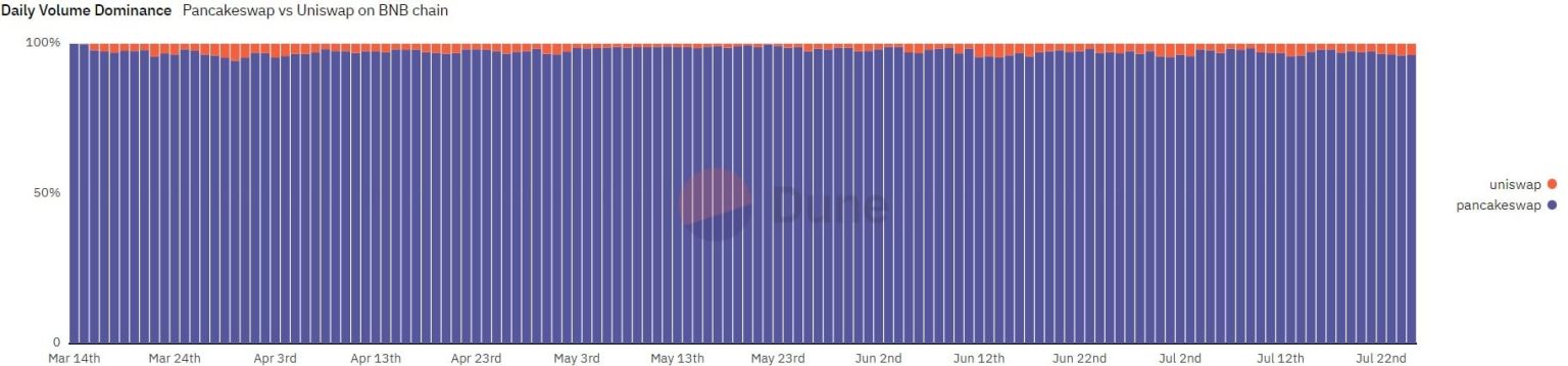 Not only that, but PancakeSwap also dominated Uniswap on BNB Chain [BNB]. This was evident from CAKE’s daily volume dominance, which consistently remained above the 90% mark.