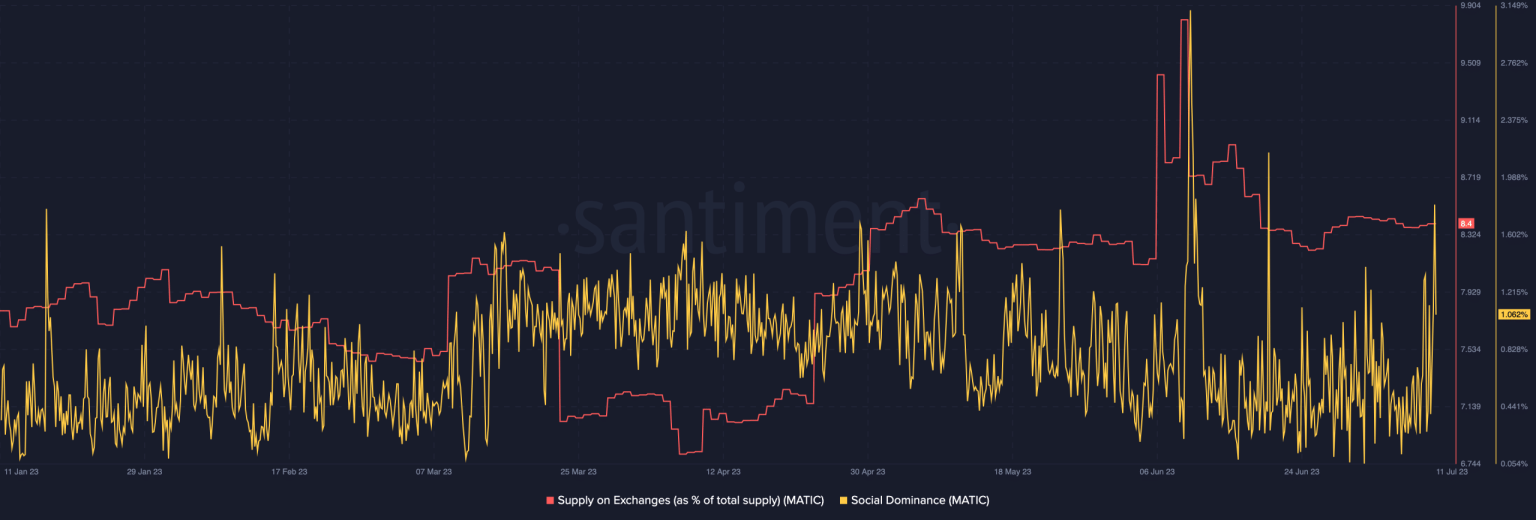 Another influential factor behind MATIC’s price rise was the supply on exchanges. At press time, MATIC’s supply on the exchange decreased to 8.4%. Previously, as of 9 July, the same metric had spiked to 9.7%.