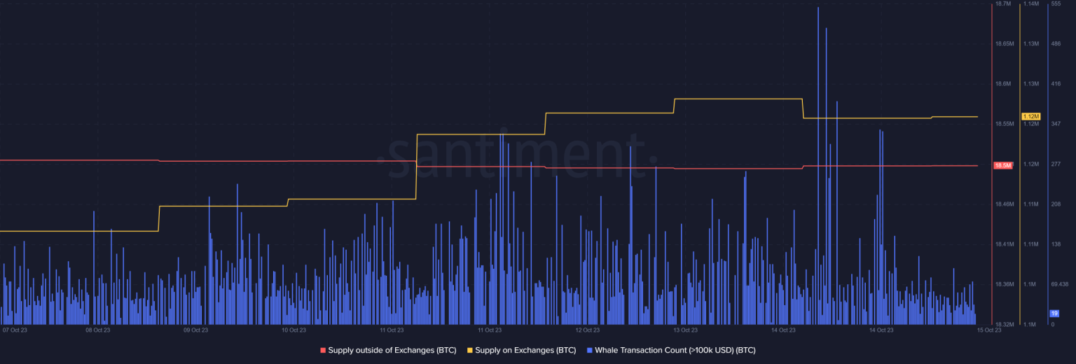 BTC’s Supply outside of Exchanges remained flat while its Supply on Exchanges increased last week, which reflected investors’ fear of a further price plummet. Nonetheless, whale activity around BTC remained high, as evident from its Whale Transaction Count.