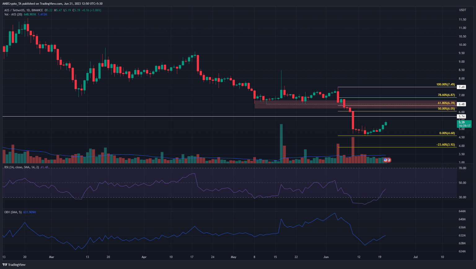 The Fibonacci levels were plotted based on the most recent leg southward and showed that the $6.05-$6.4 region could be retested before another move down. This region had acted as a zone of support in May and could act as resistance before AXS resumed its downtrend.