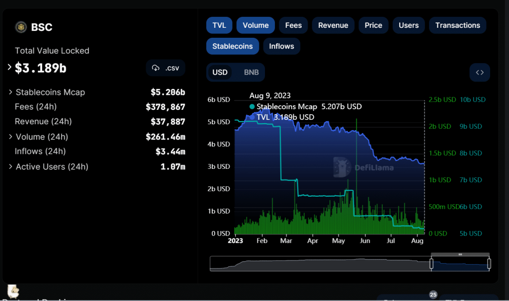 As of this writing, data from DefiLlama indicated a decrease in the Total Value Locked (TVL) on the Binance Smart Chain. Following its peak of over $5 billion in February, a downward trend became evident, with the current TVL at approximately $3.2 billion.