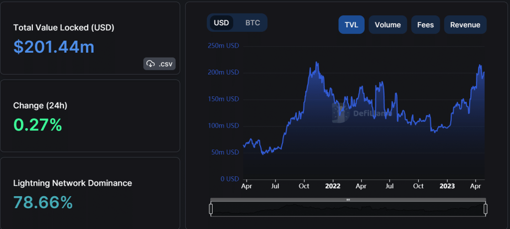 As of the time of writing, DefiLlama data showed that Bitcoin’s TVL reached $201.44 million, with an upward trend that indicates positive growth.