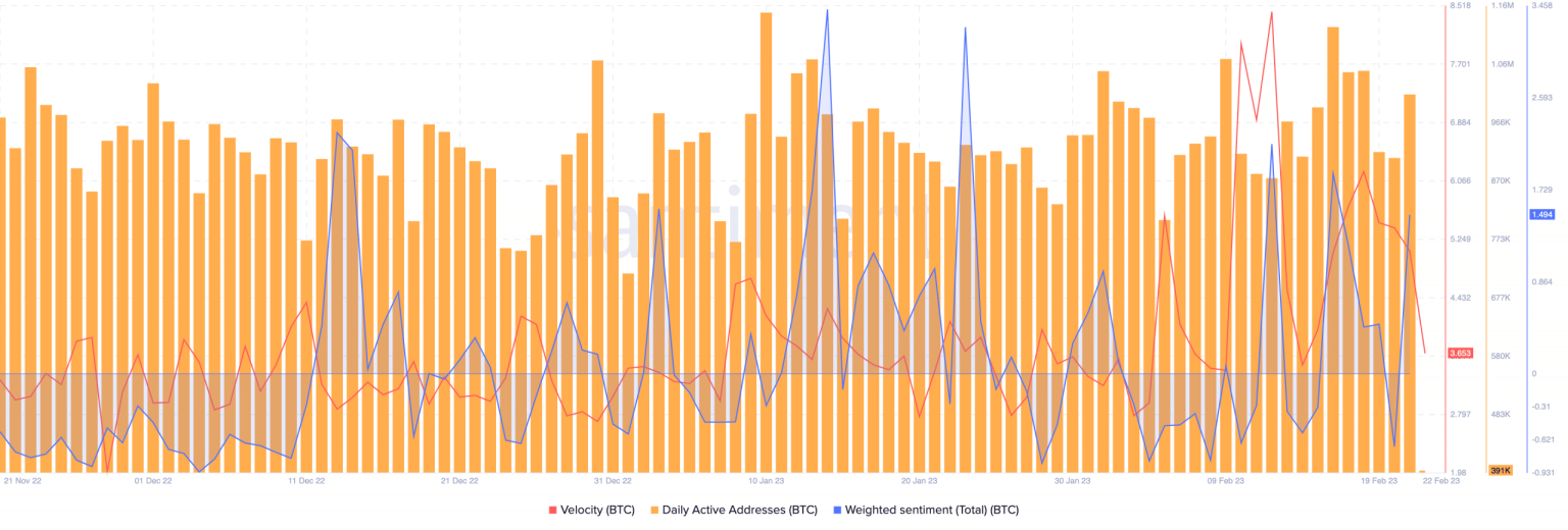Due to the positive sentiment, Bitcoin’s overall network activity increased, as highlighted by the rise in the network’s daily active addresses. Along with that, BTC’s velocity rose as well, which indicated a surge in activity.