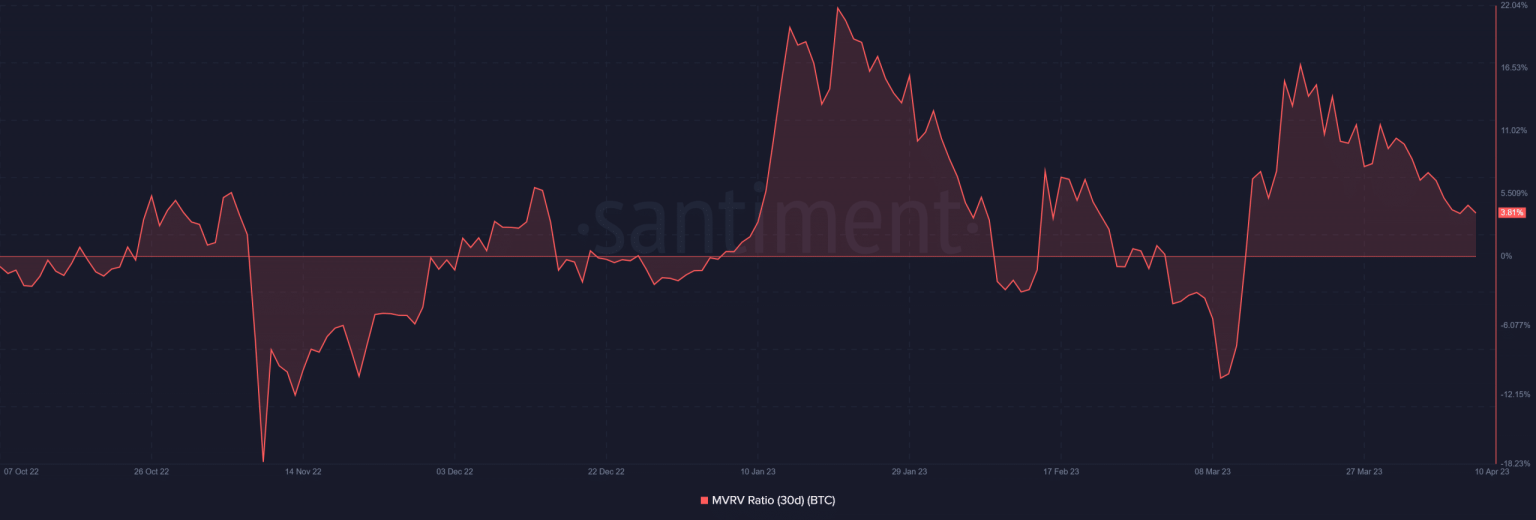 Bitcoin’s 30-day Market Value to Realized Value ratio (MVRV) indicated that it was slightly overvalued at its current price. The MVRV stood at 3.78, suggesting a potential for further price appreciation.