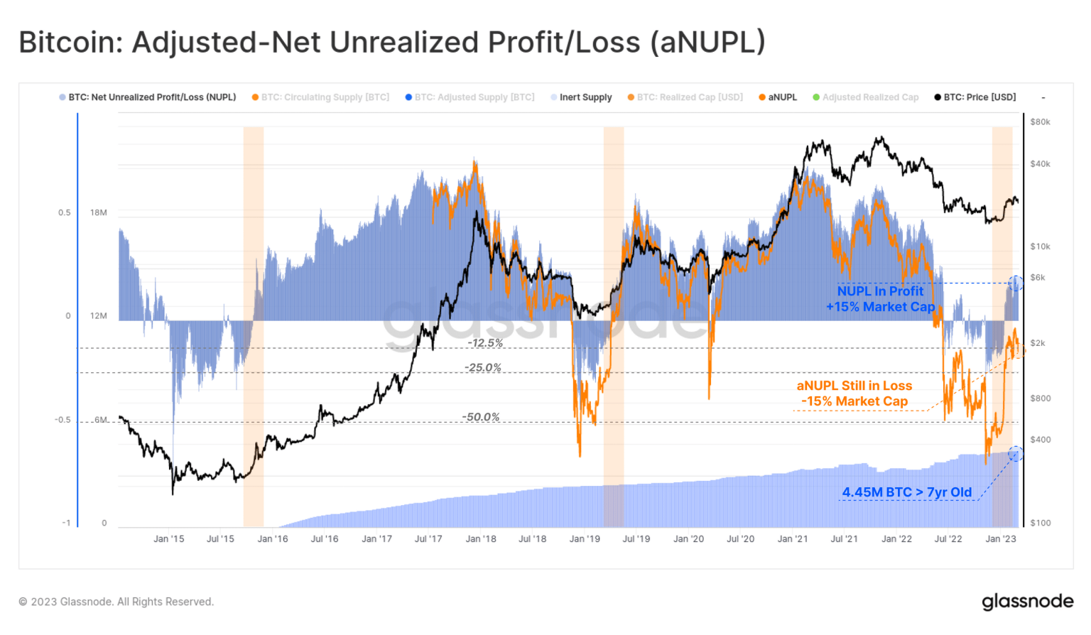 According to Glassnode, the weekly average of NUPL has changed from a state of net unrealized loss to a positive condition since mid-January. This is a sign that the typical BTC holder now holds a net unrealized profit of approximately 15% of the market cap, resembling transition phases in previous bear markets.