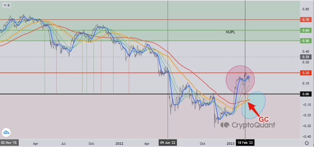 The review conducted by the analyst on BTC’s historical performance found that a golden cross, which typically occurs between the 128 and 200-day moving averages, signals the end of the accumulation phase when the NUPL metric reaches or surpasses 0.2. This signifies the commencement of a bull market.