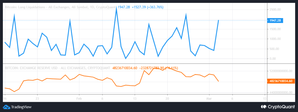 Bitcoin’s long liquidations metric soared in the last 24 hours, proving that there were a large number of leveraged positions. Liquidations surged by over 360% within a matter of hours and this might have contributed to more sell pressure. Bitcoin exchange reserves drew down slightly despite the price drop and liquidations.