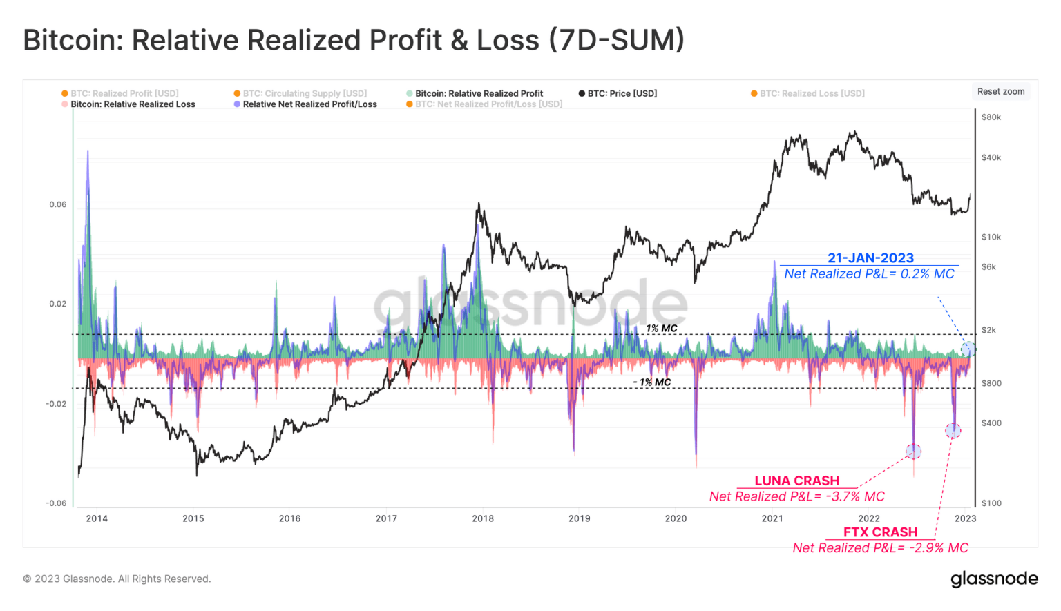 According to Glassnode, in the current bear market that began in November 2021, BTC’s Net Realized Profit and Loss metric has suffered two large capitulation events (Terra-Luna and FTX collapse), which resulted in a net loss of 2.9% and 3.7% of the king coin’s market capitalization per week, respectively.