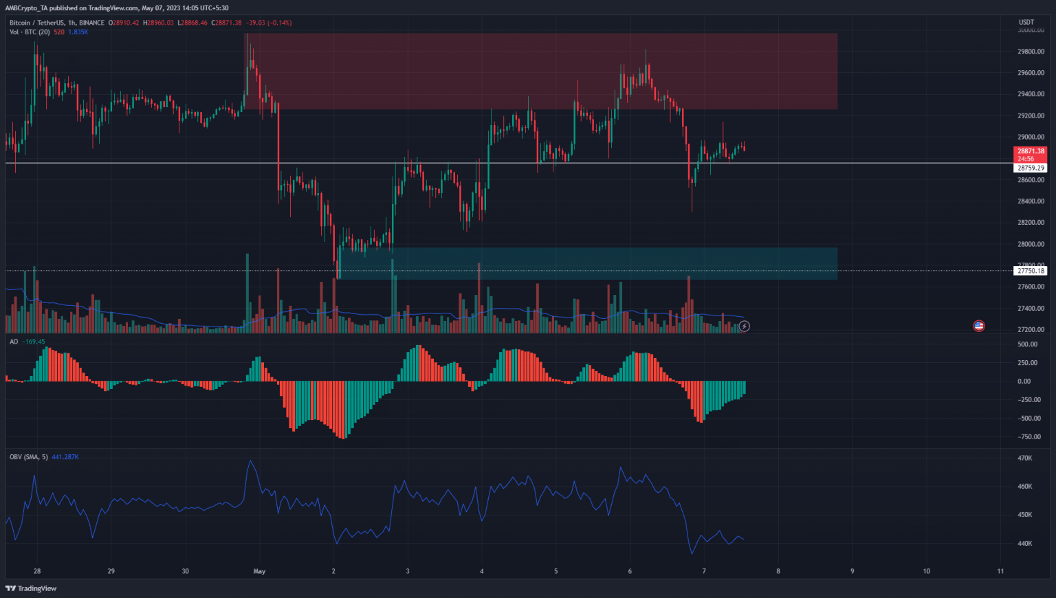 A bearish order block on the two-hour chart was highlighted in red in the chart above. It was respected over the past two days as BTC bulls were unable to drive prices past the $29.6k level. The rejection saw BTC fall to $28.6, thereby breaking the market structure and flipping it bearish.
