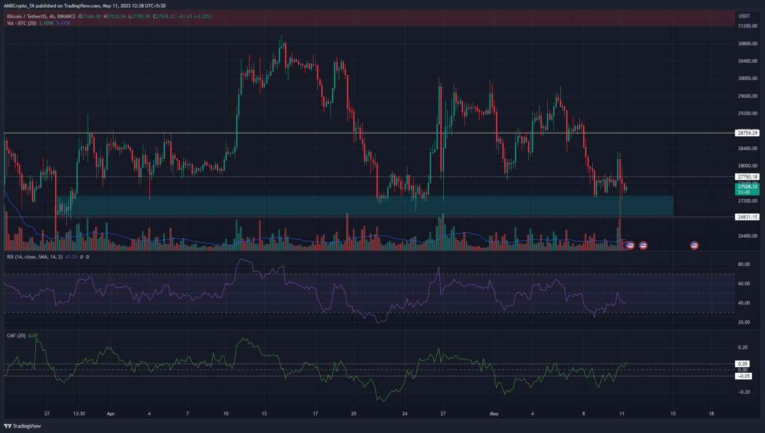 Therefore, we have the RSI and CMF in disagreement, alongside a bullish market structure. A trading session close below $27,262 on the 4-hour chart will see the structure flipping bearish once more.