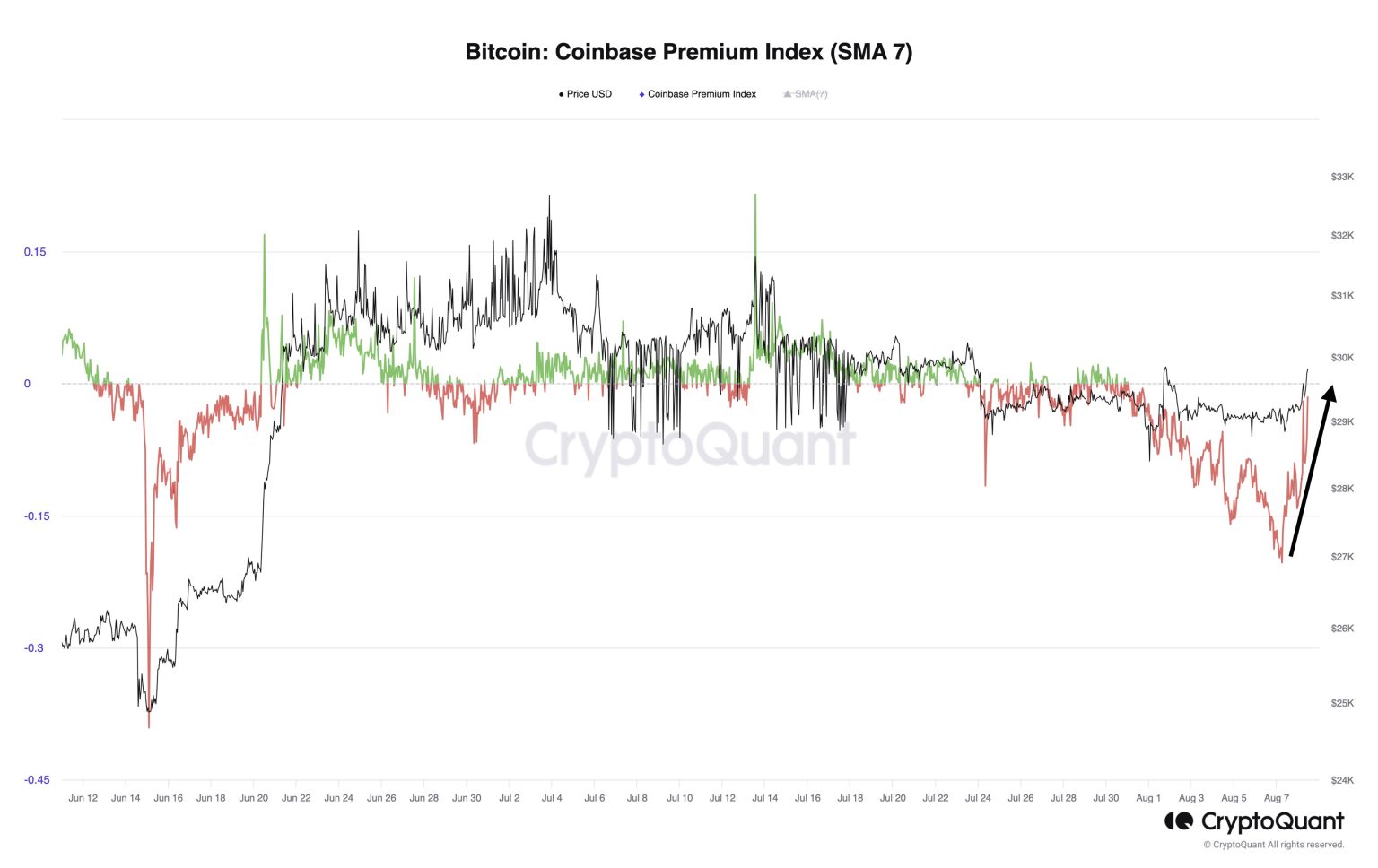 Bitcoin Coinbase Premium Index (7-Day SMA) Has Been Going Up Recently