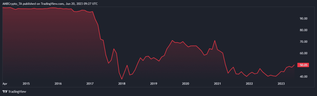 Bitcoin’s [BTC] dominance has been on the rise for the last few days. This is the first time that it has reclaimed the important 50% dominance level since April 2021, and it is an important observation for multiple reasons.