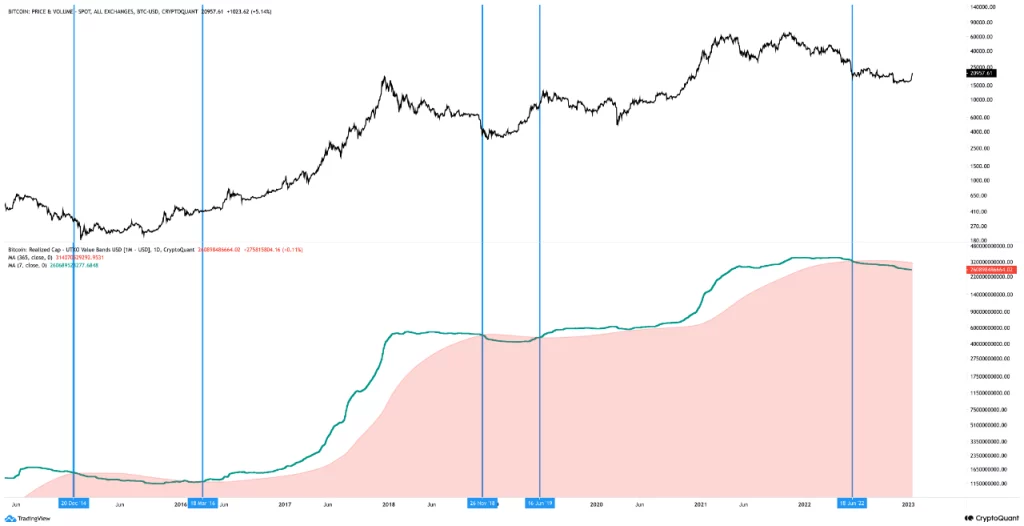 “A relief rally is highly expected until the 7 simple moving average (SMA) reaches the 356 SMA, and a real bull market might begin when the 7 SMA breaks above the 356 SMA.”