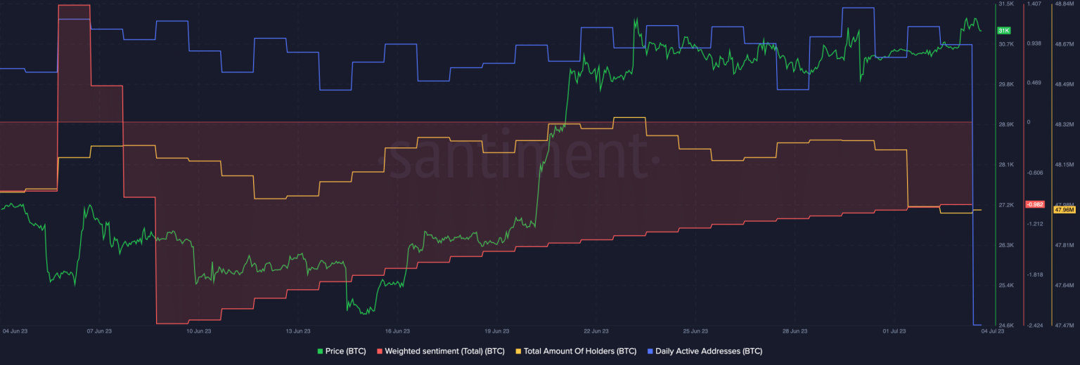 The persistence of these large firms in getting a Bitcoin ETF approved could inspire more bullish sentiment for Bitcoin. Santiment’s data revealed that the negative sentiment around BTC was observed to be gradually declining over the last few weeks. During the same period, the price of BTC surged, trading at $31,013 at press time.