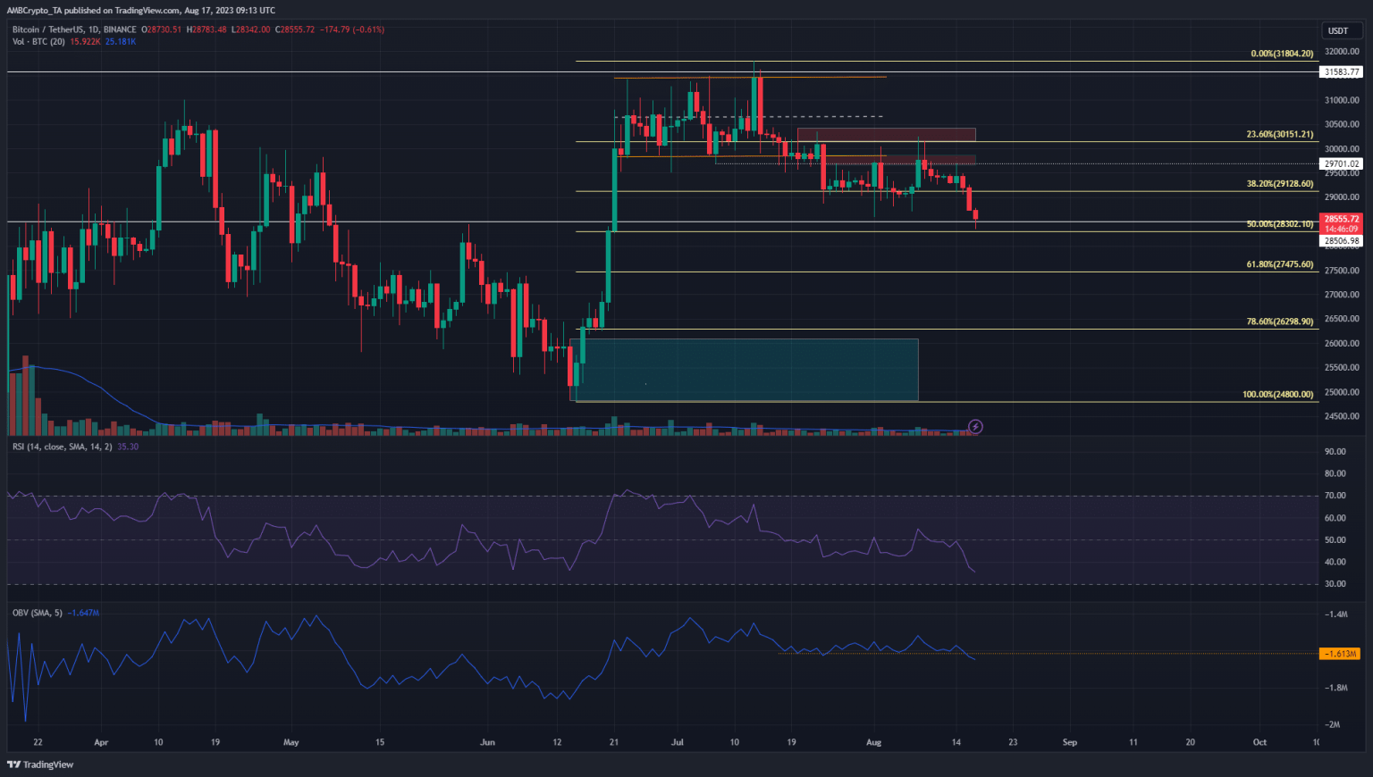 The market structure on the daily chart was flipped bearish on 24 July when Bitcoin fell below the $29.5k level, revealing bearish intent. Over the past three days, the $29.1k level was ceded to the sellers as well.
