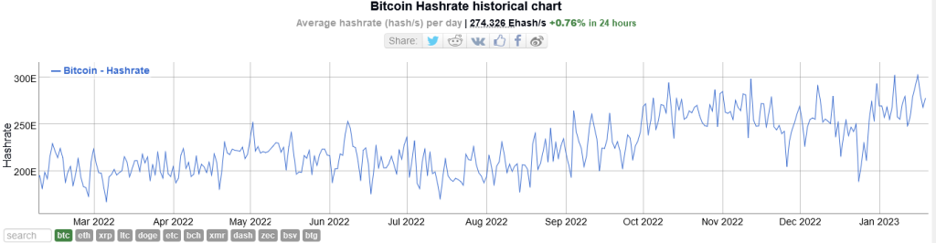 According to streams from BitInfoCharts, the Bitcoin network currently has a hash rate of 274 EH/s, up by almost one percent in the past 24 hours. Even at this pace, the hash rate is down from January 16 highs of 302 EH/s.
