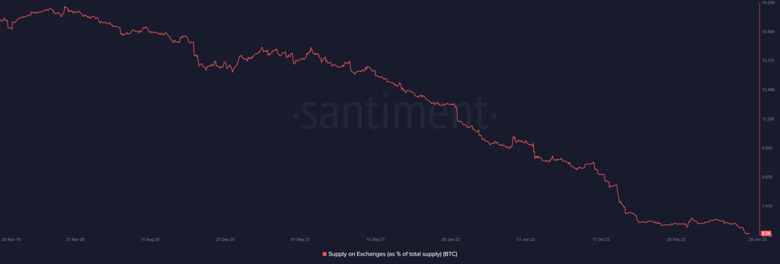 Furthermore, the dwindling supply of Bitcoin on exchanges serves as an additional testament to the illiquid nature of this asset. According to the Santiment chart, the available supply stood at approximately 6.24 at the time of writing. This metric indicates that despite the ongoing accumulation by individuals and institutions, there are no signs of a sell-off or significant supply entering the market.