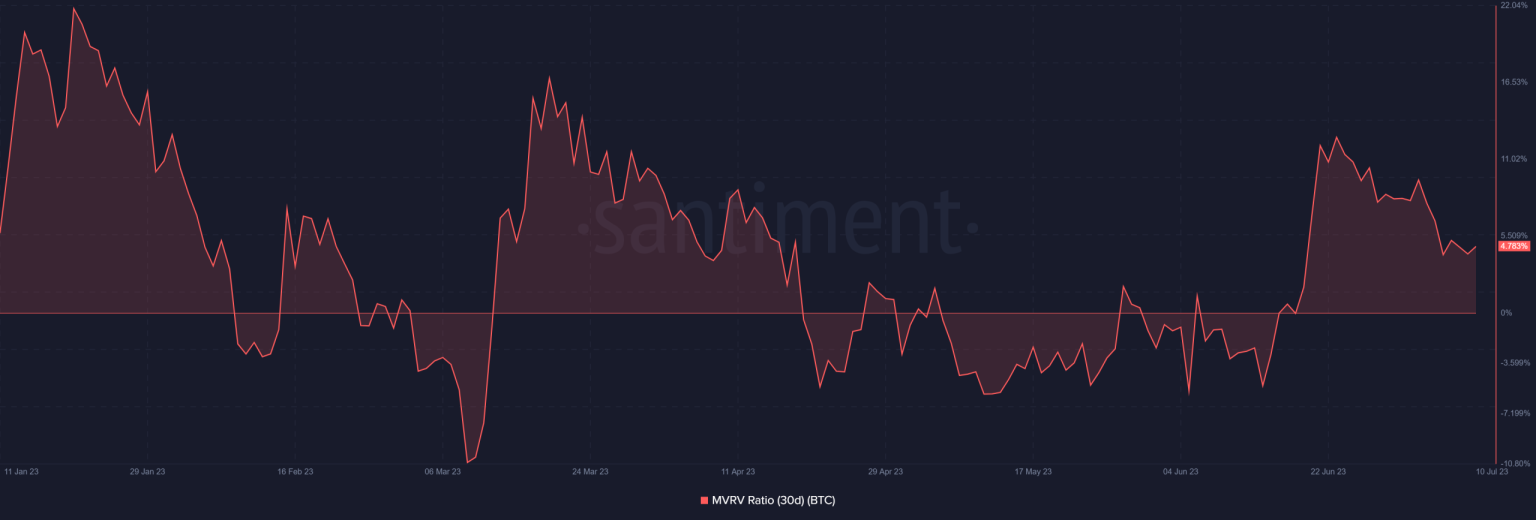 Analyzing the Bitcoin 30-day Market Value to Realized Value (MVRV) revealed an interesting trend. As of this writing, the 30-day MVRV was approximately 4.78%. This indicated that holders within this timeframe were currently holding their assets at a profit. This metric further suggested that even those who purchased their holdings at the current price range were still in a profitable position.