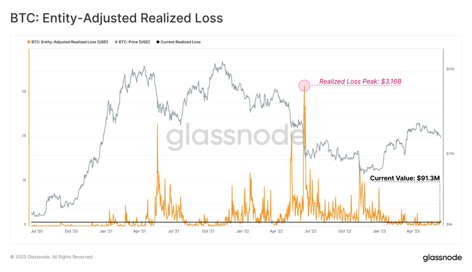 According to data from the on-chain analytics firm Glassnode, coins transacted recently were mostly acquired close to the current spot price. The relevant indicator here is the “entity-adjusted realized loss,” which measures the total loss investors realize through their current selling.