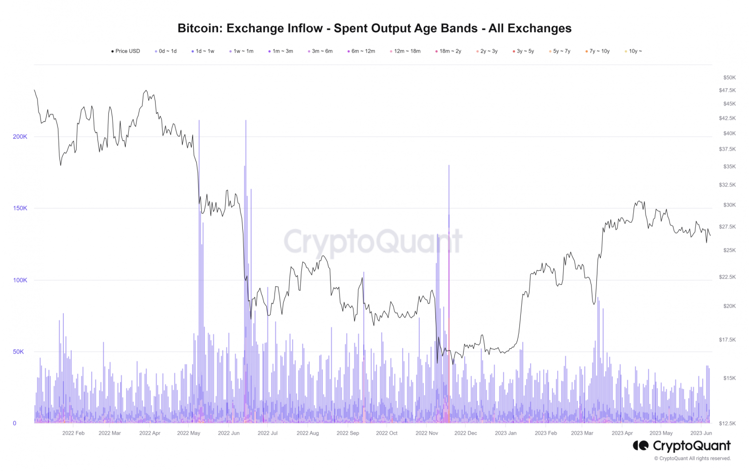 However, June 5 witnessed a significant spike in the inflow from long-term holders in the three to six-month age band. This sudden surge saw over 3,000 BTC deposited, indicating an uncommon sell-off by this particular category of long-term holders.