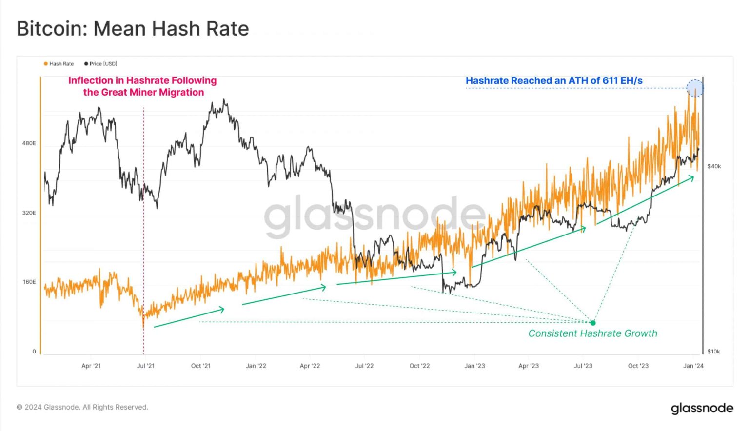 According to Glassnode, there has been an “aggressive” spike in the network’s hashrate since the U.S. Securities and Exchange Commission (SEC) gave its approval on 10th January.