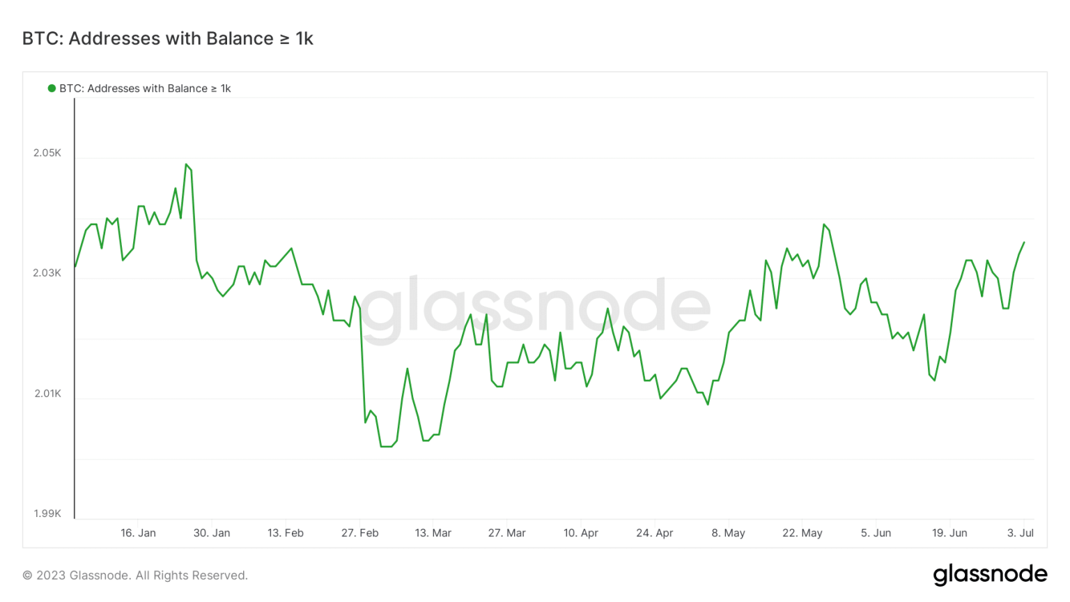 A look at address activity revealed that more whales have been finding BTC attractive in the last few months. For instance, addresses holding at least 1,000 BTC have been rising since early March.