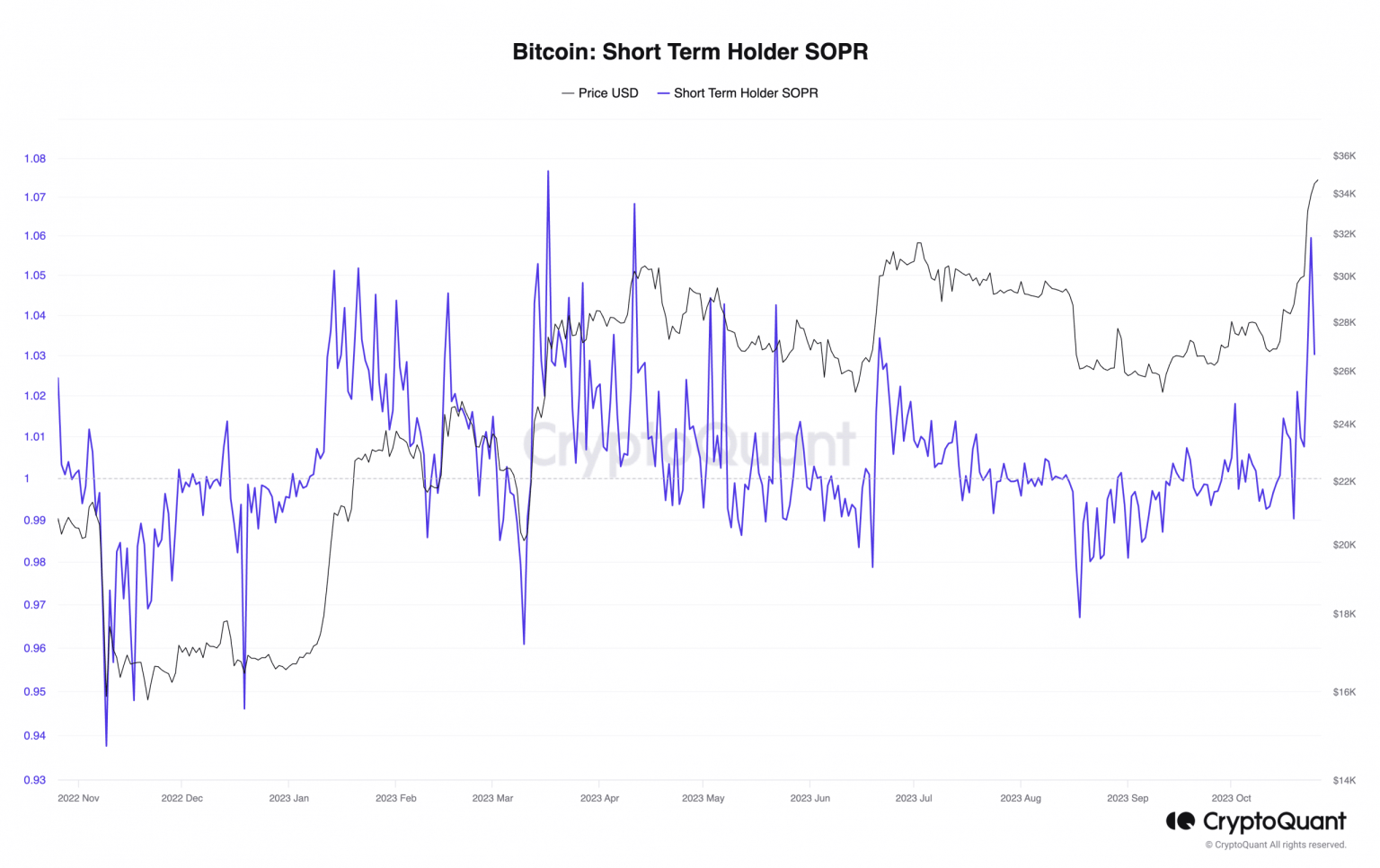 With Bitcoin [BTC] trading at multi-month highs, the Spent Output Profit Ratio (SOPR) for its short-term holders (STH) climbed to its highest level since May, data from CryptoQuant showed.