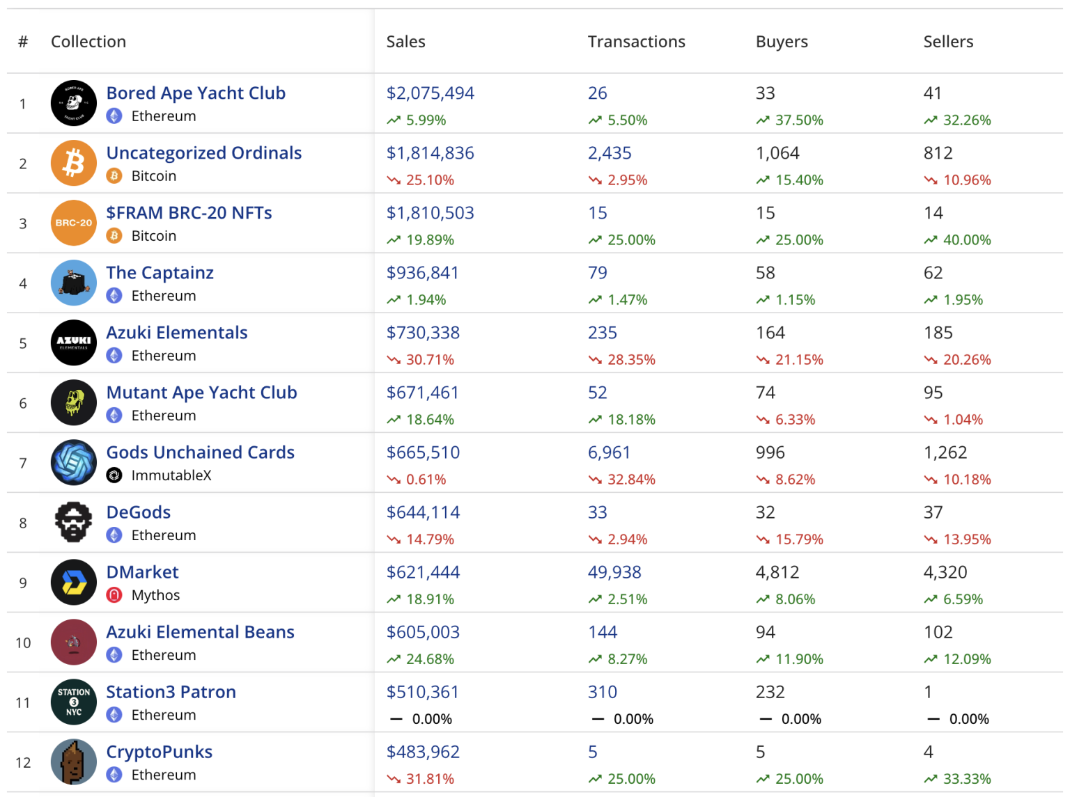Ordinals have witnessed a remarkable surge in both sales and active buyers, achieving over 130% growth in USD sales and capturing close to 10% of the buyer market. Although Ethereum currently leads the NFT sector with total sales surpassing $15.65 million, the rapid rise of Bitcoin Ordinals suggests a potential shift in dominance.