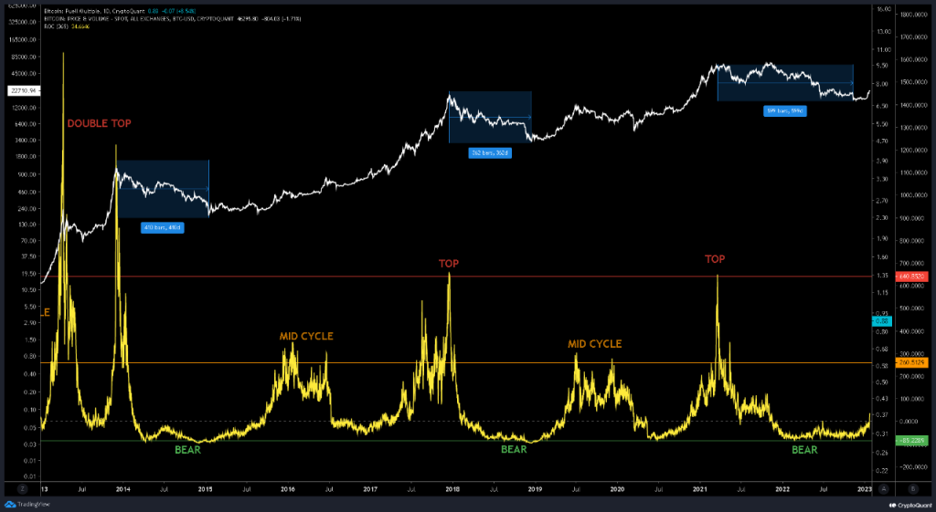 With this spike, the metric has finally crossed above the dotted line, which could mean, if the past pattern is anything to go by, that the bear market may be coming to an end, and the crypto might have started transitioning towards a bullish trend. The analyst notes, however, that it will still take some more price action before this breakout can be fully confirmed.