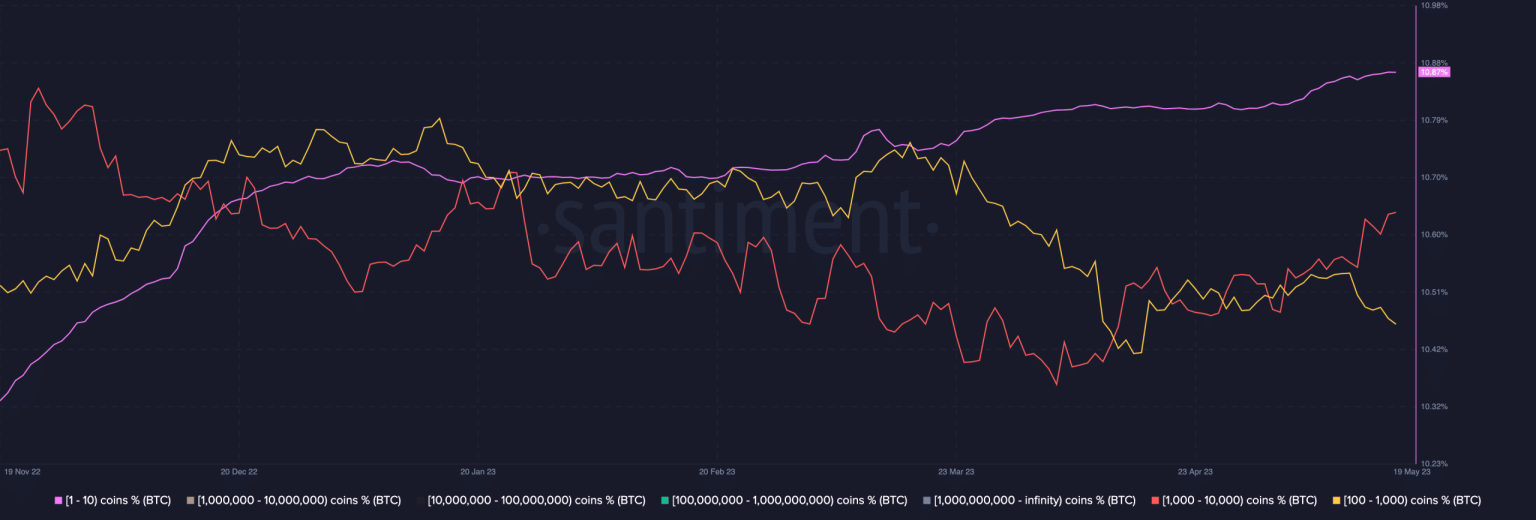 Crabs, whose demographic is those who hold between 1-10 BTC, have also increased supply by 10.87%, Santimet revealed. However, Bitcoin whales have not been able to catch up despite a recent increase in balance.