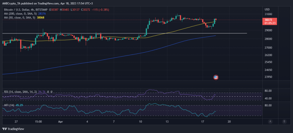 Bitcoin traded at $30,272 at press time. Its one-day price chart confirmed that it maintained relative strength above the 50% Relative Strength Index (RSI) level.