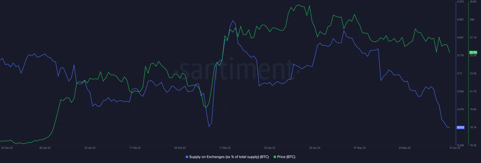 The prolonged volatility phase of May kicked off an accumulation phase that resulted in top exchanges losing a significant amount of BTC tokens. According to the Santiment graph, there has been a steady decrease in BTC supply on exchanges over the previous month, with the recent week’s events leading to a steeper decline.
