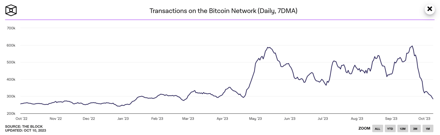 - Daily transaction count on the Bitcoin network has fallen to its lowest level since May.
