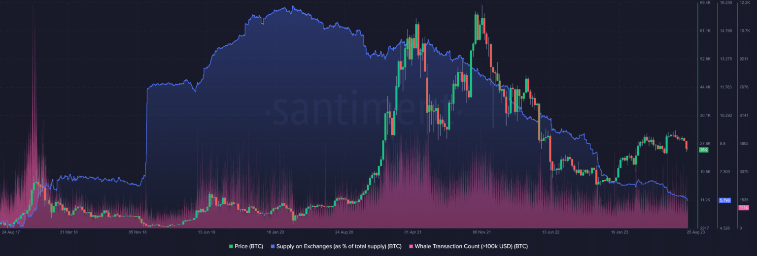 Apart from Bitcoin’s [BTC] price trend, there has been a noticeable decrease in its supply on exchanges. Recent data indicated that this decline had hit a yearly low, with large holders (whales) displaying greater interest.