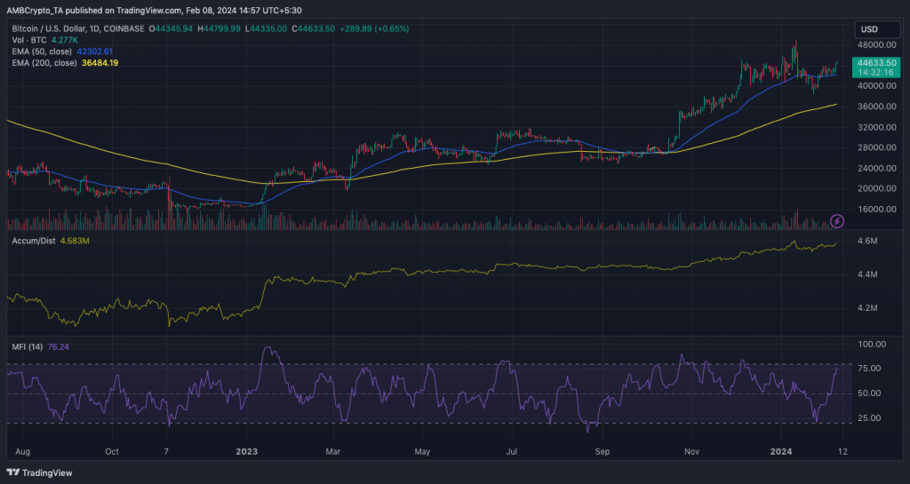 If liquidity continues to flow into the ETFs as well as the Bitcoin spot market, then a climb to $47,000 is one significant level where the coin might hit next.