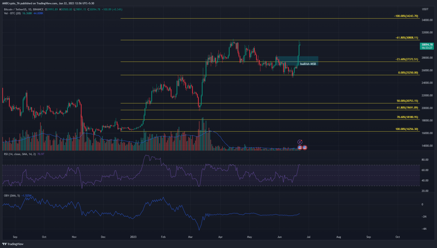 But, if the recent strength continues, such a move upward might be possible. The daily timeframe structure break was seen on 20 June. Bitcoin exploded higher on 21 June to break past another lower high at $28.5k.