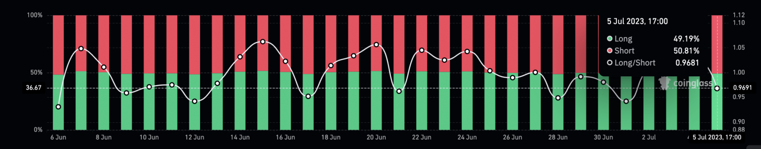 Despite so much cheer and confidence surrounding the king coin, BTC’s long/short ratio stood in a rather disappointing position. At the time of writing, BTC’s long/short ratio stood at 0.9681. 49.19% of holders took long positions whereas short position holders stood at 50.81%.